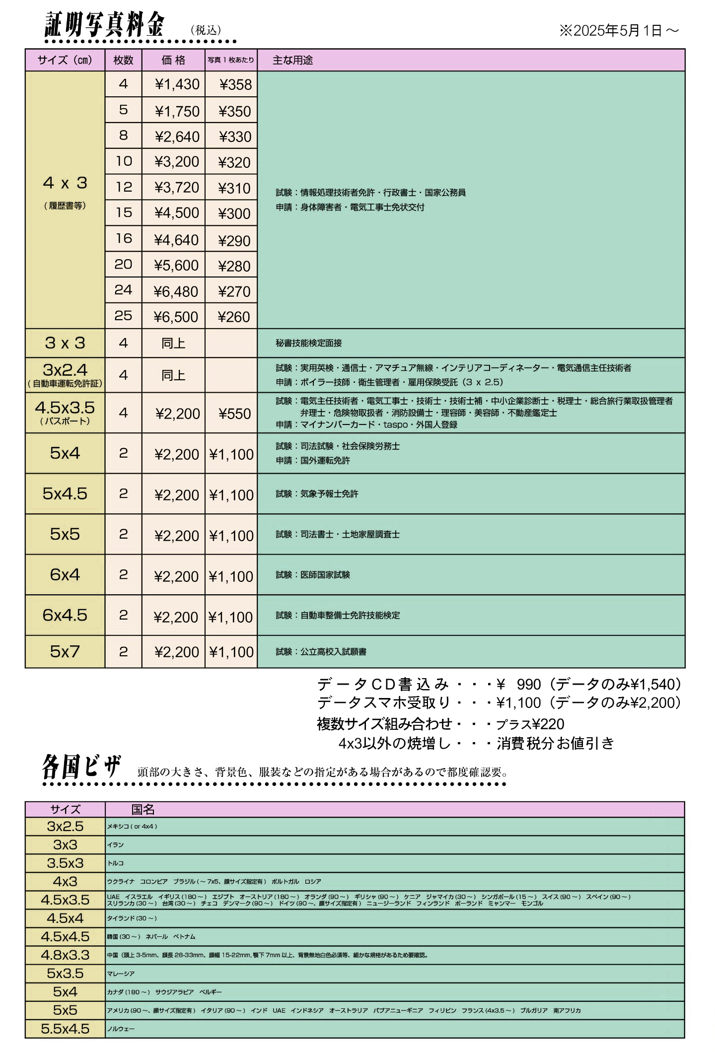 その場合は例えば、履歴書用3枚とパスポート用1枚等、異なるサイズを組み合わせてお作り出来ます。